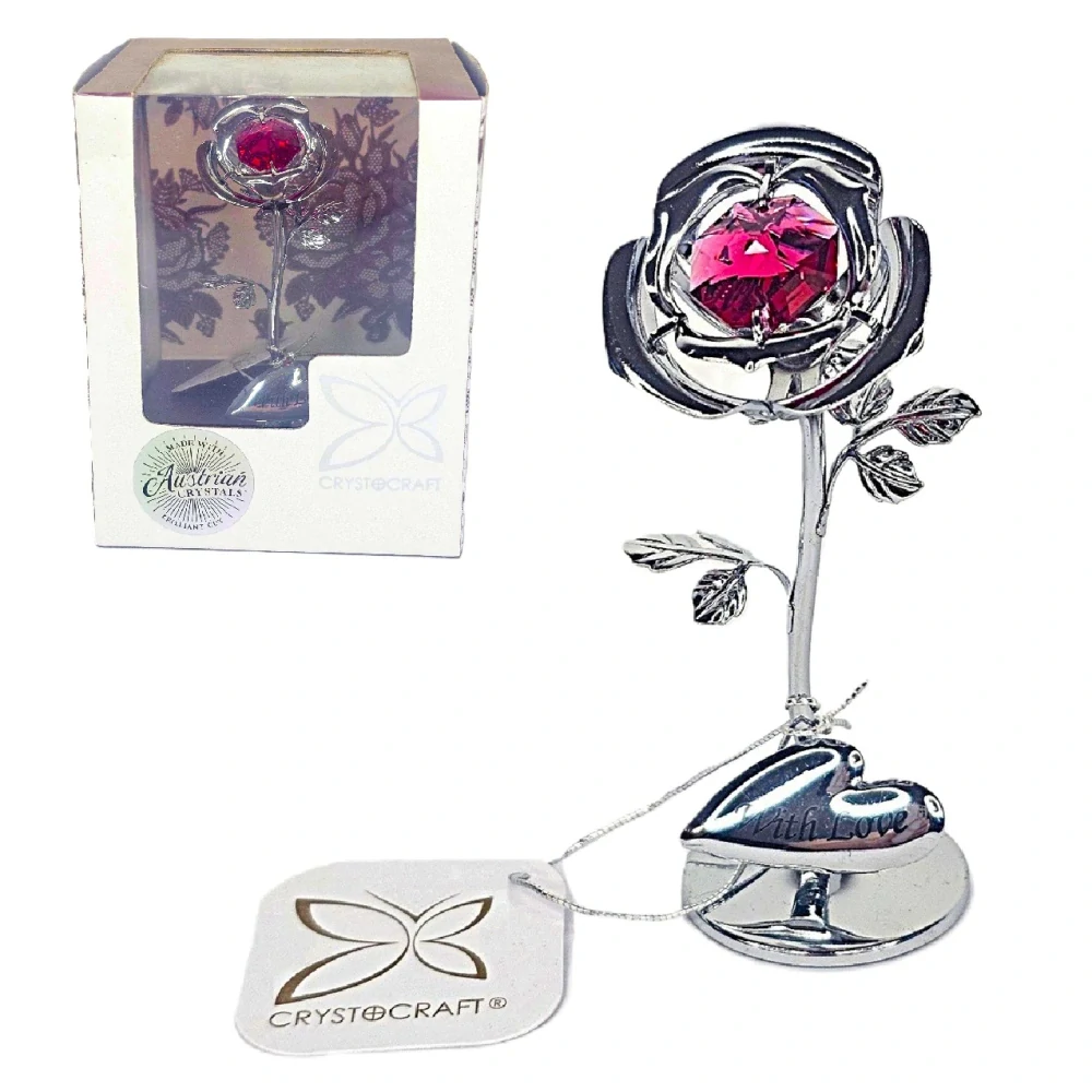 Tato růže WITH LOVE Crystocraft ve stříbrném provedení má v sobě osazený červený Rakouský krystal - "MADE WITH Austrian CRYSTALS". Crystocraft Růže má ve spodní části umístěné stříbrné srdíčko s nápisem WITH LOVE a je tedy ideálním dárkem z lásky, k Valentýnu nebo jako drobný svatební dar. Je skvělým designovaným doplňkem. Doporučujeme jako zamilovaný dárek pro ženy, babičky i dívky k narozeninám, k svátku, k Vánocům a hlavně k Valentýnu. Dodáváme v šedé krabičce s motivem květin a stříbrným logem CRYSTOCRAFT v podobě motýla s transparentní přední částí.