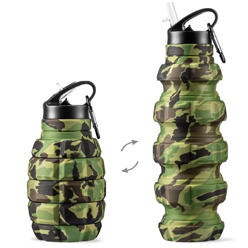 Tato skládací láhev má zajímavý design ve tvaru maskáčového granátu a je velmi funkční. Je vyrobena z kvalitního platinového silikonu, proto je velmi odolná, bez zápachu, zcela netoxická a zároveň flexibilní. Díky tomuto materiálu a tvarování ji lze snadno složit (zmáčknout), proto se pak vejde do batohu nebo do tašky, kde zabere méně místa.