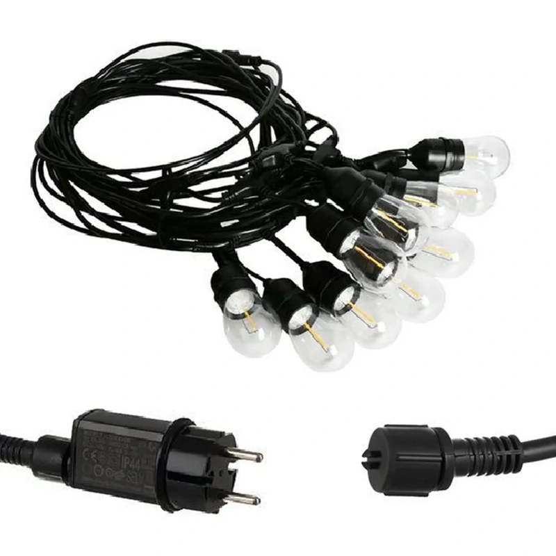 Tato girlanda žárovek dokáže díky trvalému monochromnímu teplému světlu vykouzlit kdekoliv na zahradě nádhernou a kouzelnou atmosféru (lze jí zavěsit na pergole, na stromě, na plotě nebo kolem posezení na terase). Obsahuje 10 zavěšených žárovek na hlavním kabelu od sebe vždy 50 cm a u každého zavěšení je háček k uchycení. Napájení je díky adaptéru z běžné elektrické sítě 220-240V, ale do girlandy jde pouze bezpečných 24V. Girlanda je 5 metrů dlouhá a vodotěsná s ochranou IP44. Díky tomu jsou kabel a svítící žárovky odolné vůči nepříznivým povětrnostním vlivům, včetně stříkající vody z libovolného směru. Tato venkovní girlanda je ukončena speciální malou koncovkou, na kterou je možné napojit další stejnou girlandu. Tím je možné více žárovkových girland spojit v jeden libovolně dlouhý grilandový řetěz.