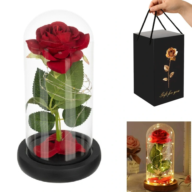 Zasklenou růži na tmavém podstavci s LED světlem – červenou doporučujeme jako zamilovaný dárek pro slečny, dívky a ženy, k Valentýnu, k narozeninám, k svátku, ale i k Vánocům. Dodáváme v kartonové dárkové krabičce s úchyty a s vyobrazením zlaté růže a zlatým nápisem Gift for you.